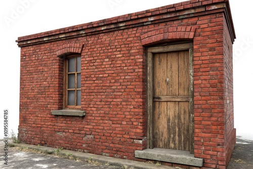 A single vertical window on a red brick wall with a brick facade and a wooden door in a worn state of repair, rustic charm, old building