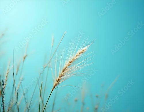 A single wheat stalk stands out against a soft blue sky, creating a serene and minimalist composition.