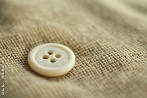 A Single White Button Rests On Beige Fabric