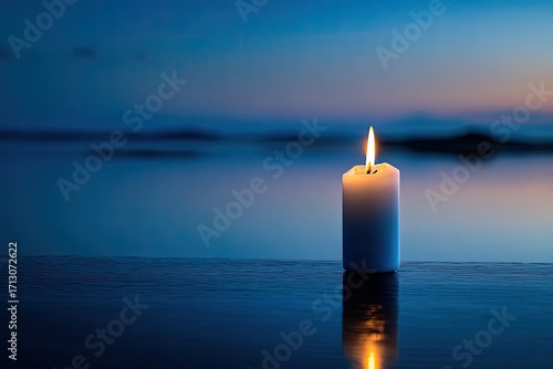 A single white candle flame illuminates a tranquil twilight scene over water