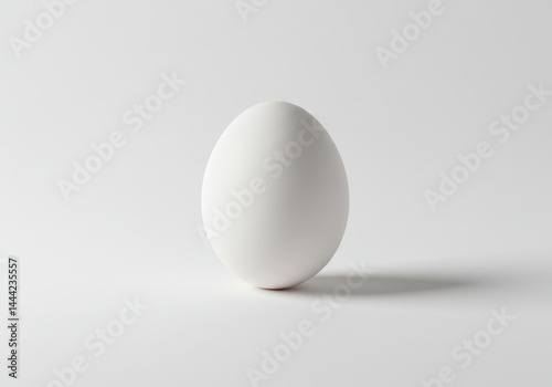 A single white egg standing upright on a white surface with a soft shadow on the right side of the egg