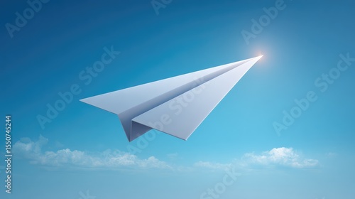 A Single White Paper Airplane Soars Through a Clear Blue Sky with a Glimmering Sunlight in the Background, Symbolizing Freedom, Creativity, and Imagination