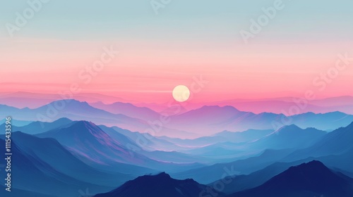 sky, sun, sunset, mountain, horizon, cloud, pink, blue, gradient, hazy, layered, range, light, dusk, evening, abstract, mist, fog, atmospheric, serene, tranquil, dreamy, peaceful, calming, beautiful, vibrant, high-coloured, majestic, grand, landscape, nature, scenic, artwork, digital, art, illustration, painting, graphic, design