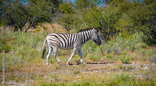 A single zebra moves gracefully across the grassy savanna with bushes in the background. Captures the essence of African wildlife and adventure in natural landscapes.
