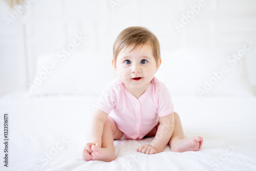 a six-month-old baby is sitting on a white cotton bed at home, a cute little baby girl in a pink bodysuit is smiling and rejoicing, close-up