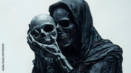 A skeletal executioner holding a Halloween mask in one hand, dark and eerie style, cinematic lighting, isolated on white background