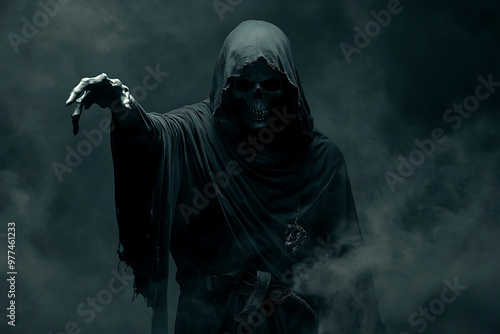 skeleton, cloak, dark, mist, eerie, figure, hand, death, skittish, atmosphere, horror, mysterious, shadow, ghost, fantasy, symbolism, fear, ominous, spectral, grim, legend, folklore, supernatural, chilling, haunting, monochrome, silhouette, scene, dramatic, ancient, character, icon, representation, imagination, art, design, visual, photo, concept, theme, narrative, mood, expression, creativity, cinematic, storytelling
