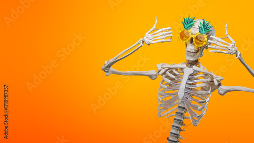 A skeleton showing his happy thumb with pinneapple background 4K HD