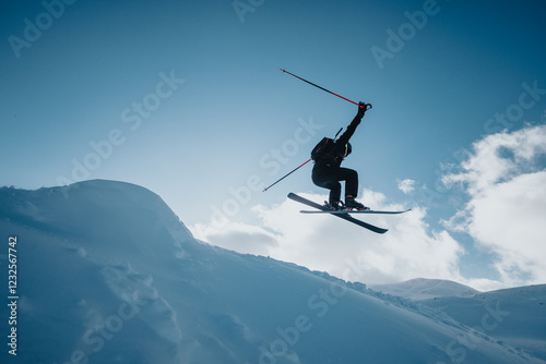 skiing, mountain, snow, jump, aerial, adventure, sport, landscape, athletic, freestyle, winter, active, skier, action, sky, cold, extreme, motion, nature, hobby, exercise, blue skies, high altitude, skill, challenge, speed, leisure, recreation, mountain peak, adrenalin, fitness, competition, travel, vertical, holiday, performance, precision, determination, elegance, energy, freedom, grace, inspiration