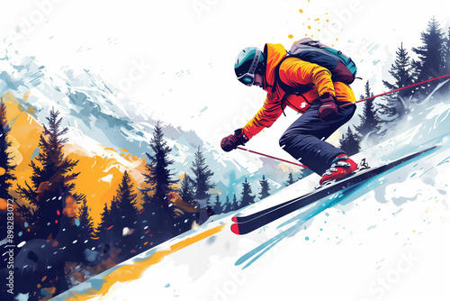 skiing, skier, mountain, slope, snow, winter, adventure, sport, landscape, tree, peak, sky, blue, vibrant, colours, downhill, speed, freedom, winter sports, extreme sport, action, adrenalin, exhilaration, cold, fresh, powder, nature, outdoors, travel, journey, challenge, skill, equipment, ski, pole, helmet, goggles, jacket, glove, boot