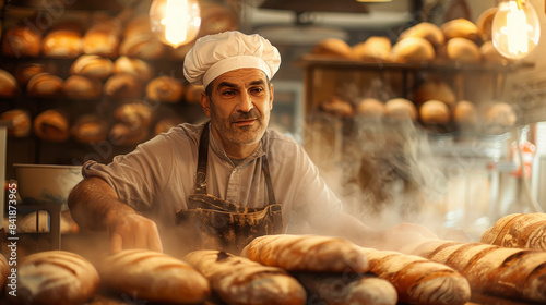 A skilled baker proudly displays freshly baked bread in a warm, inviting bakery setting. The atmosphere exudes craftsmanship and tradition.