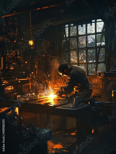 A skilled welder working diligently in a workshop, sparks fly as he creates with precision and expertise. The image represents craftsmanship, dedication, and the transformative power of welding.