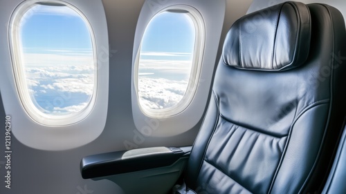 A sleek airplane seat beside two large windows, offering a view of clouds and blue sky, showcasing the comfort of air travel.