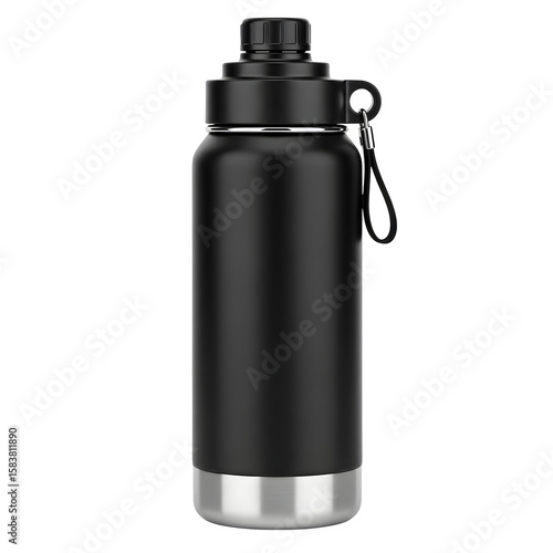 bottle, water, hydratation, drink, recyclable, black, metal, stainless, container, portable, fitness, health, lifestyle, equipment, accessory, thermos, flask, isolated, object, studio, design, nobody, blank, modern, elegant, sleek, silver, cap, travel, active, well-being, healthy, refreshment, thirst, diet, energy, product, metallic, single, background, close, indoor, ware, transparent