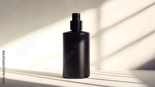 A sleek, black spray bottle stands under the play of light and shadow, suggesting a product designed for both functionality and sophistication.