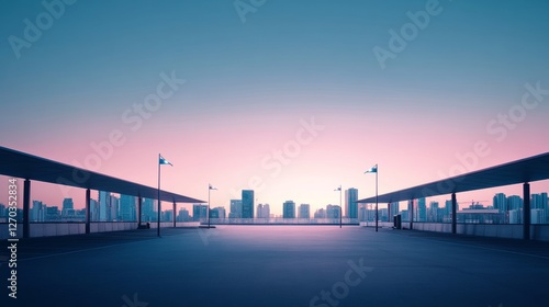 A sleek car plaza with a skyline under the first light of dawn. Featuring freshness and renewal