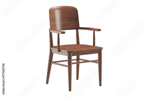 A sleek, classic wooden armchair featuring a rich brown finish and elegant curved armrests, presented on a solid background. background removed