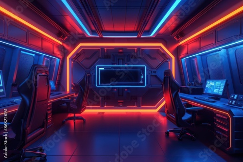 A sleek, futuristic gaming lounge where players strategize for their next big esport match with augmented reality displays with copy space