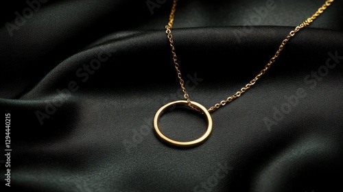 A sleek gold lariat necklace displayed on a glossy jet-black background
