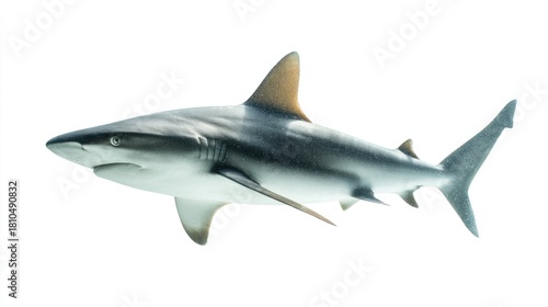 A sleek, gray shark swims gracefully against a stark white background, showcasing its dorsal fin, pectoral fins, and caudal fin in a clear, crisp shot
