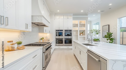A sleek kitchen featuring white cabinets, marble countertops, and stainless steel appliances.