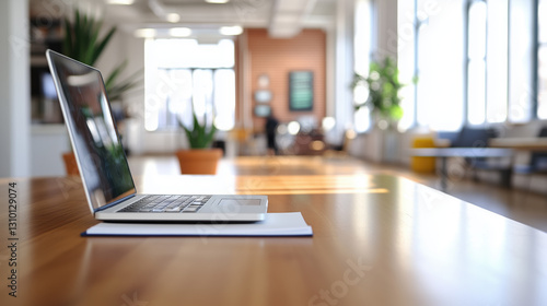 A Sleek Meeting Table in a Spacious Office, Laptop and Notepads, Business People in the Blurred Background During a Strategic Meeting, Collaborative Atmosphere copy space