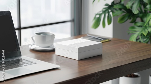 A sleek, modern receipt box on a minimalist desk, with a laptop and a cup of coffee nearby