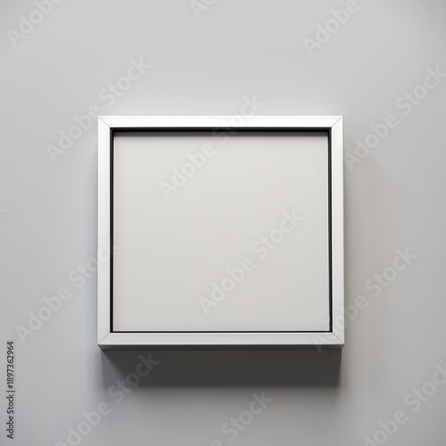 A sleek silver frame mockup on a plain gray wall, viewed from the front, showcasing a blank canvas