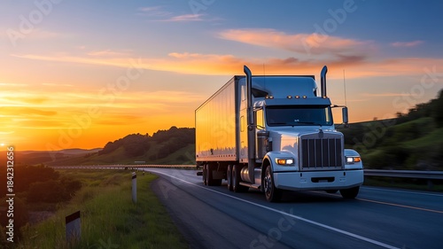 A sleek white semi truck drives on a highway during a vibrant sunset with rolling hills and a beautiful orange sky.