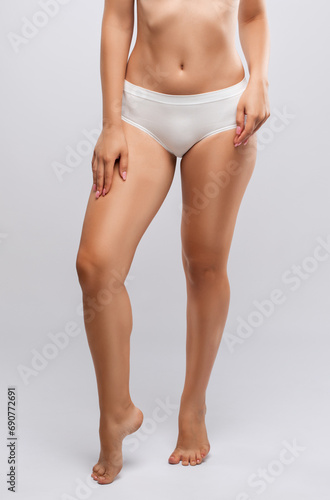 A slender swarthy woman in a white underwear on a white background. Healthy lifestyle, sport and diet.