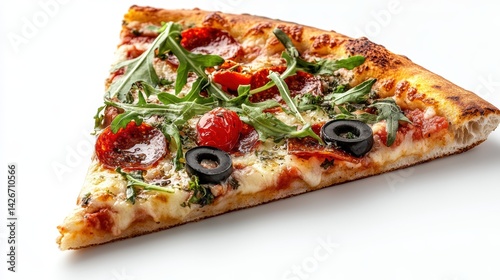 A slice of pizza isolated on a pure white background, realistic lighting and shadow, ideal for cut-out and compositing
