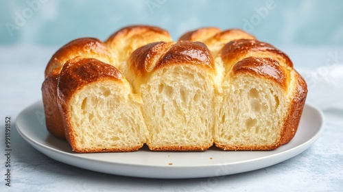 A sliced loaf of brioche, with its soft, golden interior, placed on a white ceramic plate with a pale blue background for a fresh, morning vibe
