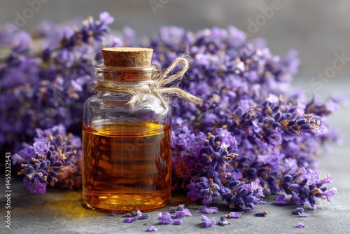 A small bottle of lavender essential oil sits nestled amongst a bouquet of fresh lavender flowers. The warm, golden hue of the oil contrasts beautifully with the purple blossoms.