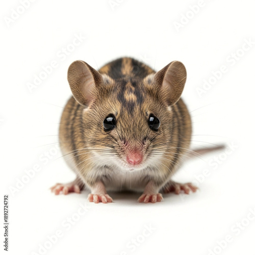 A small brown mouse with black eyes and white whiskers standing on a white background