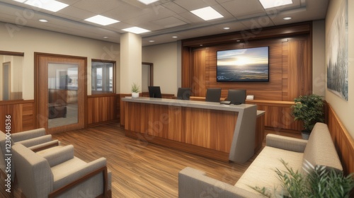 A small business reception area with wooden aesthetics, cozy seating, and a television playing ambient visuals