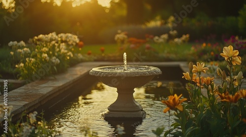 garden, fountain, sunset, water, flower, bloom, summer, nature, beauty, calmness, peace, serenity, landscape, park, design, decoration, backyard, relaxation, peaceful, romantic, vibrant, colourful, lush, green, fresh, bright, gold, light, warm, elegant, classic, antique, stone, architecture, duck pond, lily, floral, blossom, plant, leaf, grass, ground, path, brick, texture, pattern, background
