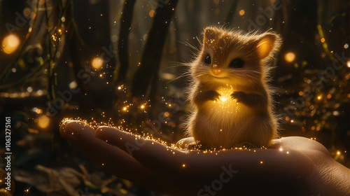 cute, fluffy, animal, small, adorable, rodent, magic, sparkle, glowing, fantasy, forest, night, dark, hand, fairy, magical, mythical, timberland, whimsical, fairy tale, nature, enchanted, firefly, light, gold, dreamy, mystical, creature, enchanted forest, golden light