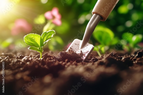 gardening, trowel, dirtied, planting, flower, garden, sunlight, vibrant, tool, rich, nature, green, cultivation, hobby, spring, landscaping, blooming, preparation, spade, growth, earth, environmentally friendly, backyard, home, fresh, nurture, sunshine, plant, leaf, dirt, germ bud, agriculture, growing, germinating, small
