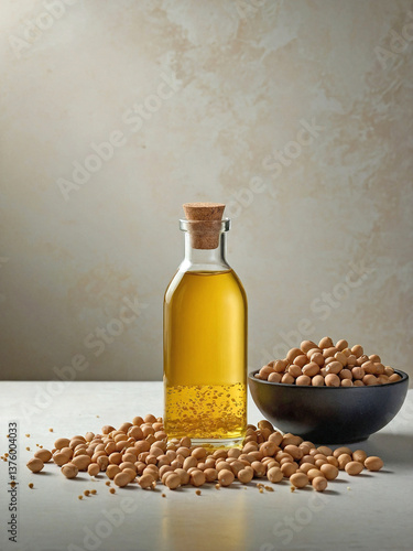 a small glass jug or bottle filled with pure soybean oil