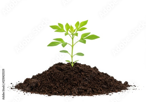 A small green plant sprouting from a mound of rich brown soil, isolated on a white background