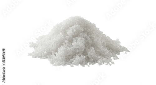 A small, irregular pile of transparent, translucent, highly reflective granular crystalline material, resembling coarse sea salt or sugar crystals, isolated on a transparent background with softbox