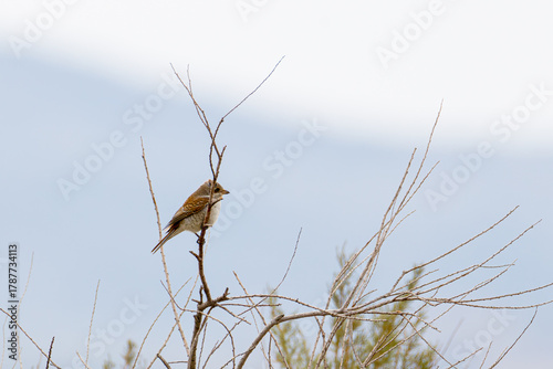 A small Lanius collurio perched on a bare branch against a soft blue sky.