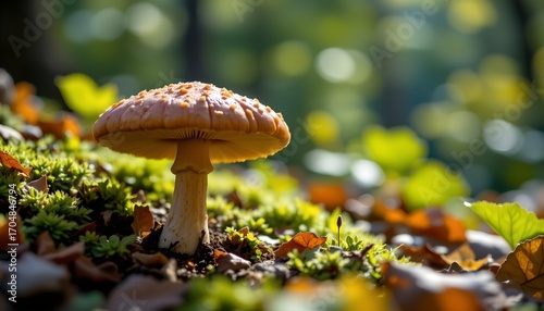 small, mushroom, xanthous, orange, hue, bed, fallen, leaf, forest, setting, nature, autumn, fungal, toadstool, red, food, amanita, boletus, poisonous, fungal, moss, agaric, green, mushroom, grass, fly, poison, white, season, edible, cap, brown, wood