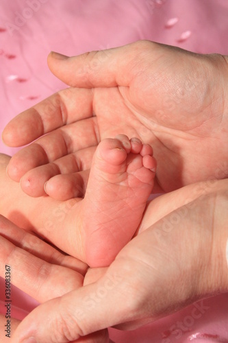 a small newborn baby in the arms of its mother, the mother holds the newborn's legs in her hands