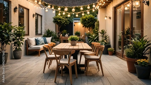 A small patio with wooden furniture, potted plants, and a hanging string of lights