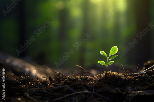 a small plant sprouting from the ground in a dark forest, green leaves, early in the morning, branching, brightly-lit, beautiful image, pc wallpaper