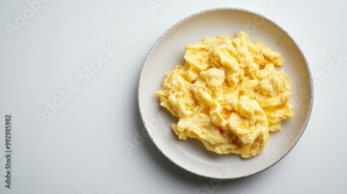 A small plate of scrambled eggs, softly folded and golden, positioned on a white background to create a clean and minimalist food image.