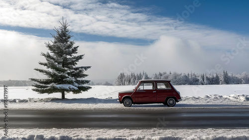 car, snow, red, road, small, parking, winter, vehicle, environment, covered, side, landscape, cold, outdoors, white, street, scene, transport, frosty, icy, rural, isolated, compact, parked, terrain, nature, chilly, travel, urban, automobile, scenery, snowy, glacé, pavement, serene, driving, lonely, minimalistic, distant, peaceful, desolate