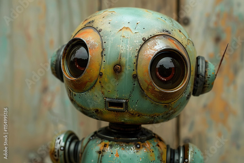 baby, robot, metallic, figure, rustic, background, shiny, eye, curious, expression, charming, design, futuristic, toy, antique, style, whimsical, appearance, unique, character, handcraft, collectable, item, detailed, craftsmanship, storytelling, art, imaginative, play, decorative, object, retro, aesthetic, playful, detail, piece, decor, creative, small, sculpture, friendly, face, interactive, display, vintage, vibe, cute