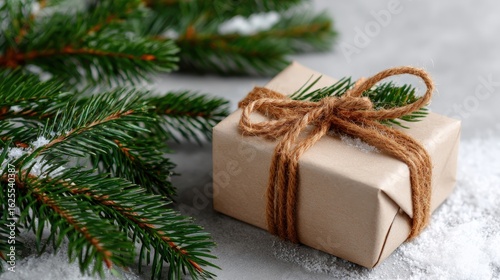 christmas, gift, present, holiday, winter, snow, evergreen, tree branch, decoration, rustic, brown, paper, twine, bow, festive, celebration, nature, season, wrapping, simple, elegance, cosy, tradition, surprise, craft, hand-made, environmentally friendly, pine, greenery, texture, background, white, minimalist, natural, december, new, year, joy, cheer, ornamental, foliage, serene, 2026